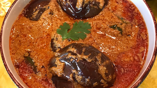 When the gravy begins to bubble well, add the fried brinjals and stir. Add more water if needed to bring the gravy to a consistency.