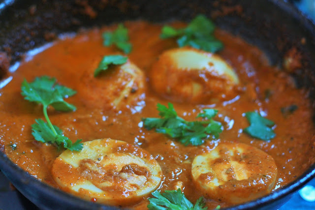 Cook on a medium heat until the gravy thickens. Add salt and check the taste. Add the roasted eggs and coriander leaves. Switch off or continue to cook the eggs in gravy for a while. Keep it covered until ready to serve.