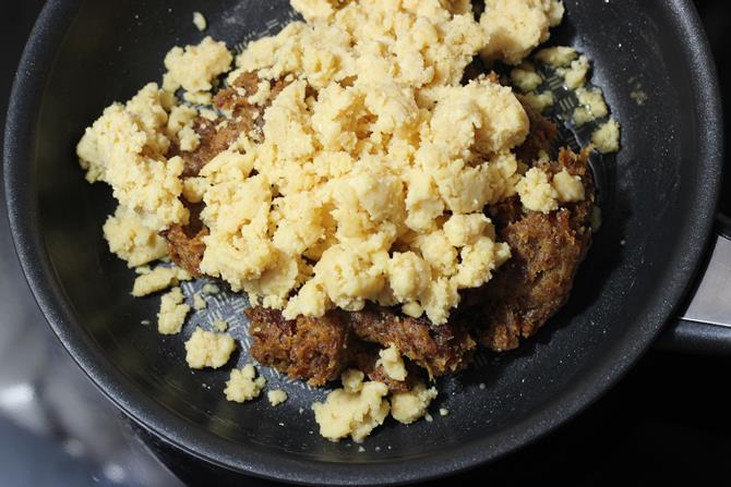 When the mixture is done, it will leave the sides of the pan. It turns to a mass as well.