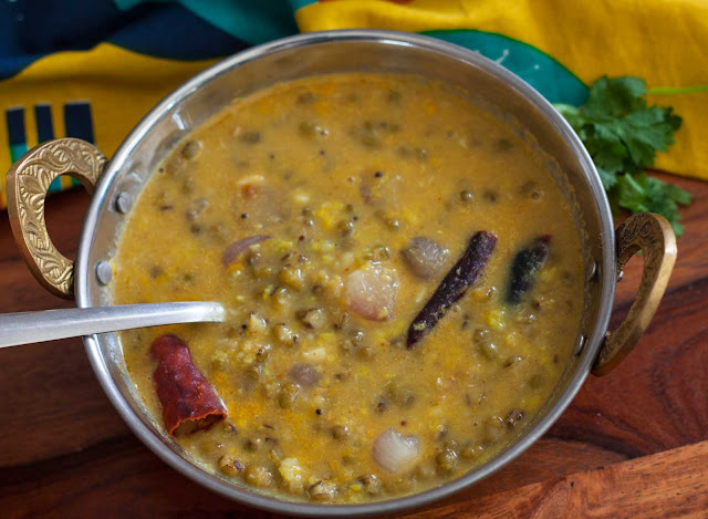 you can use coconut milk or grated coconut or paste to the curry. If using grated coconut or paste add it just before adding green gram and fry for about 2 to 3 minutes. If using coconut milk, add ¼ cup water to the curry to cook, once the gram is cooked fully, pour ¼ cup coconut milk and allow it to bubble. Do not overcook. Switch off the stove.