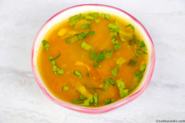 Pressure cook dal till smooth. I usually use 1 cup of water for ½ cup of dal and pressure cook for 2 whistles on a medium flame. When the pressure releases mash it well.